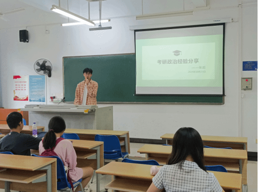 10月23日星期三7-8节是研究生张超的考研政治经验分享课。他主要从考研政治选择题备考经验,材料分析题备考经验和心得体会三个方面来展开。在课程正式开始前,他先对考研政治各板块分值分布进行了讲解,并推荐了部分考研政治必需书籍。在选择题备考经验部分,他重点强调了打牢基础,多刷题,并着重讲解了2025年考研政治单项选择题的新题型。在材料分析题备考经验部分,他主要分享了高分答题方法和答题技巧。在分享备考的心得体会时,他告诉同学们要保持良好的心态,按自己的节奏循序渐进的进行复习。在交流互动和答疑环节中,他对同学们提出的问题进行了解答并给予了合理的建议。