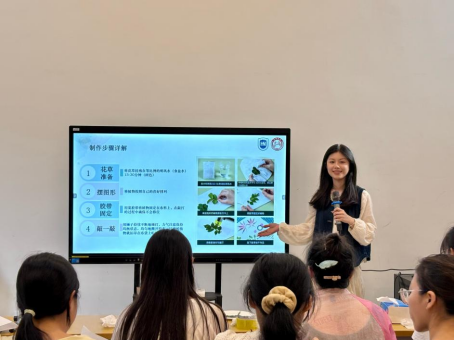 课程伊始,李忆蕊老师讲解了植物拓染的历史渊源、所需材料与工具并分享了创意作品图片,让同学们对植物拓染有了更深刻的认识。随后,李老师详细讲解了拓染的步骤和注意事项并现场演示植物拓染的细节与技巧,从植物的挑选、摆放,到敲打力度的控制等方面一一演示,同学们听得津津有味。