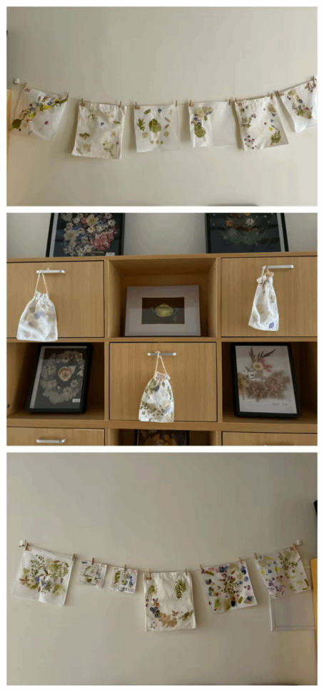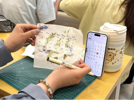 同学们精心挑选形态完整、色泽鲜艳的叶片与花瓣,用明矾水对它们进行固色处理,再将其艺术化地排列在帆布包上。伴随着叮咚作响的敲打声,植物汁液缓缓渗透进织物,最终,每件作品都化作了独一无二的“自然指纹”。课堂上弥漫着草木清香,同学们互相展示着创意成果。