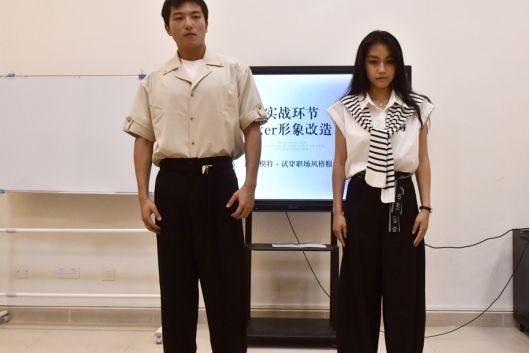 经过对理论知识的初步了解,我们现场寻找了两位模特进行换装,将课程提到的理论具象化。同一基础套装通过更换配饰,风格即刻转变;不同风格穿搭示范,直观呈现职场造型差异。主讲人同步解析要点,让穿搭技巧一目了然。