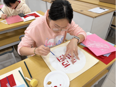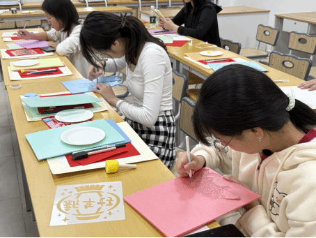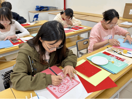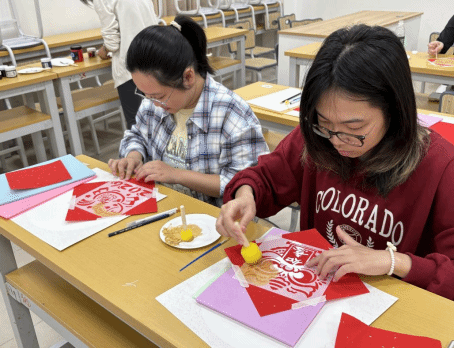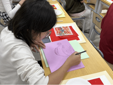 课上,李忆蕊老师深入浅出地讲解了拓印的悠久历史、丰富寓意以及独特制作工艺,从古代祈福辟邪的传统,到如今承载阖家团圆的美好愿景,让大家对这一传统技艺有了全新的认识。随后,同学们兴致盎然地动手制作,精心描摹图案、仔细雕刻、拓染上色,每一步都专注细致。