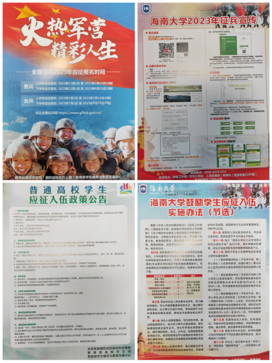 2023年5月17日中午,为响应学校《海南大学鼓励学生应征入伍实施办法》的实施,鼓励大学生应征入伍、履行国家义务、促进学生成长成才,william威廉英国官网于海甸校区7栋宿舍楼前设立入伍咨询点,进行入伍宣传并发放退伍学生风采集。