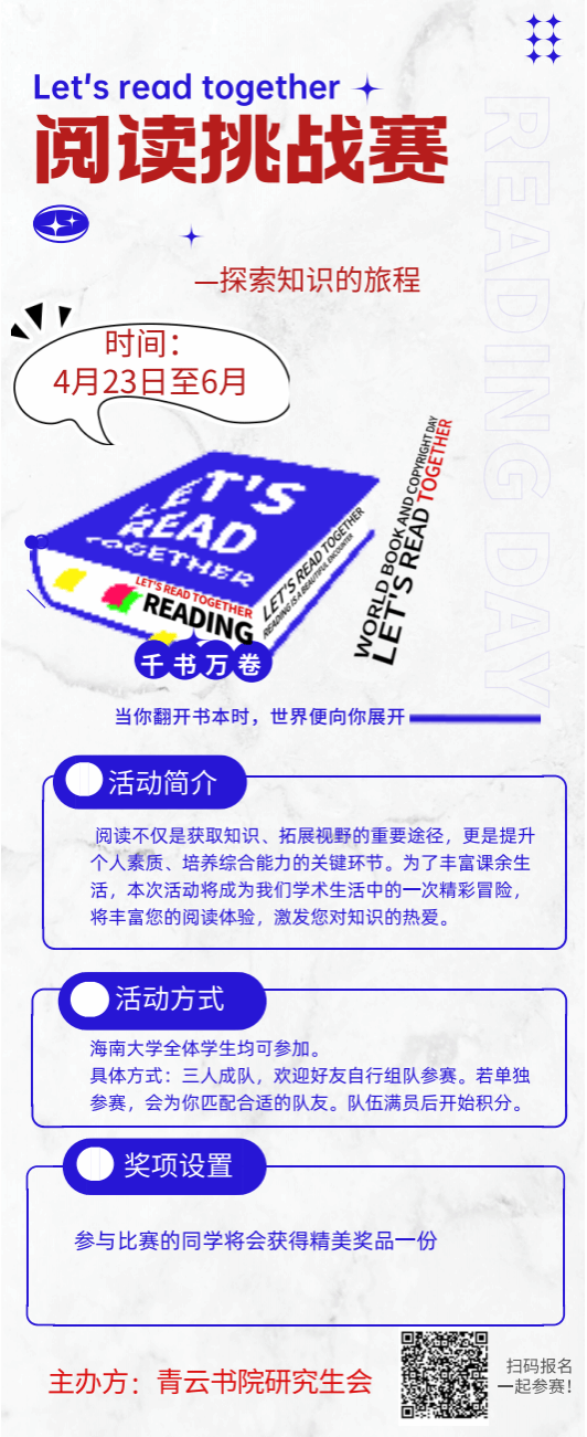 “新质驿站”为基础,持续开展“阅读挑战赛”,从而不断提升同学们的综合素质和创新能力,详情见宣传海报。