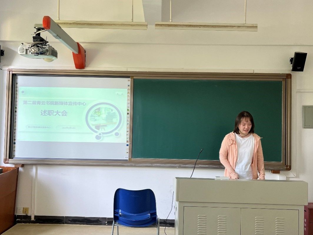 大会第一项,由张紫涵主任进行讲话。主任对过去一年中心的工作进行了全面总结和回顾。她提到,新媒体宣传中心充分利用新媒体技术的优势,积极推广书院文化,扩大校园影响力,取得了显著成绩。同时,主任也对各部门过去一年的辛苦付出给予了充分肯定,指出了当前工作中存在的问题和不足,并提出了改进措施,希望大家在未来能够再接再厉,认真处理好每一项工作。