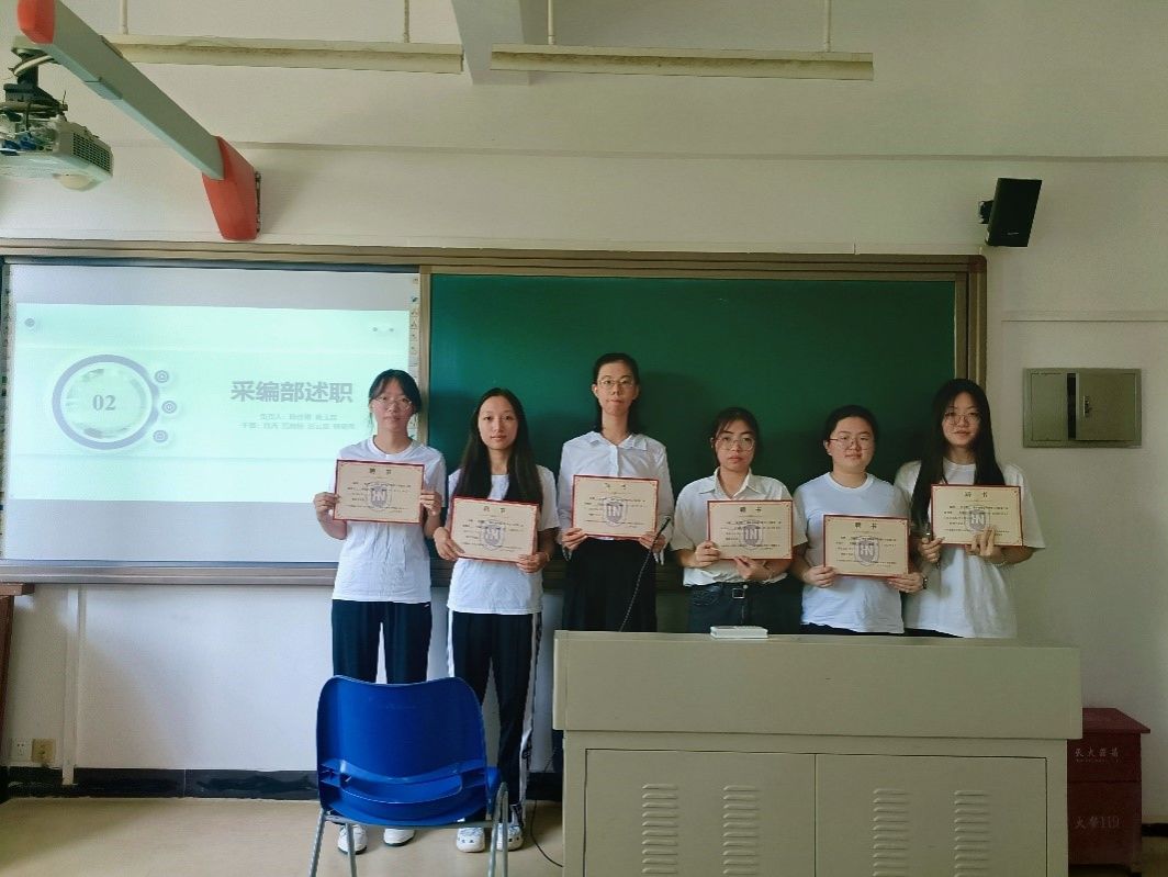 大会第三项,颁发聘书并进行集体合照。胡悦和张紫涵主任为各部门成员颁发聘书,对各位成员过去一年的工作表现表示认可和赞扬。同时,新媒体宣传中心全体成员合影留念。