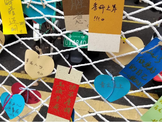 本次活动在八栋宿舍楼下举行,同学们可以领取一张心愿签,将自己对于考研心得、心愿或对即将考研同学的祝福书写在签纸上,同时还可以领取随机小礼物一份。