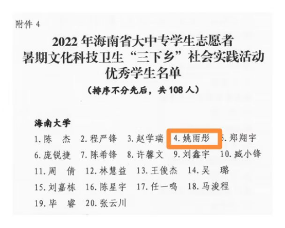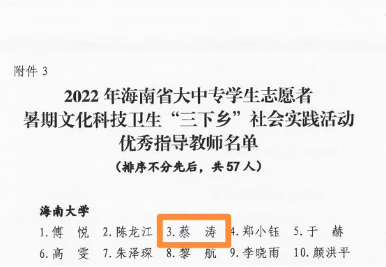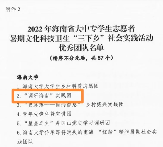 近日,共青团海南省委、海南省教育厅、海南省学生联合会联合发布了《关于2022年海南省大中专学生志愿者暑期文化科技卫生“三下乡”社会实践活动评选结果的通报》文件,我院“调研海南”实践团荣获海南省“三下乡”社会实践优秀团队,我院蔡涛老师荣获海南省“三下乡”社会实践优秀指导教师,姚雨彤同学荣获海南省“三下乡”社会实践活动优秀学生荣誉称号。